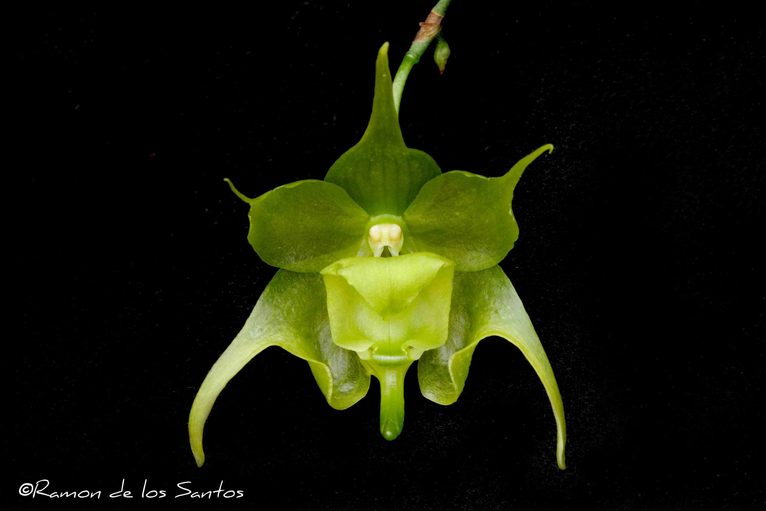 Twelve flowers and seven buds on two up to 121-cm highly branched inflorescences, many mature buds at terminal ends of the branched inflorescences; sepals and petals acuminate, chartreuse, darker venation; lip recurve apically, spur curving downward, translucent chartreuse; column and anther cap light cream; substance good; texture glossy.