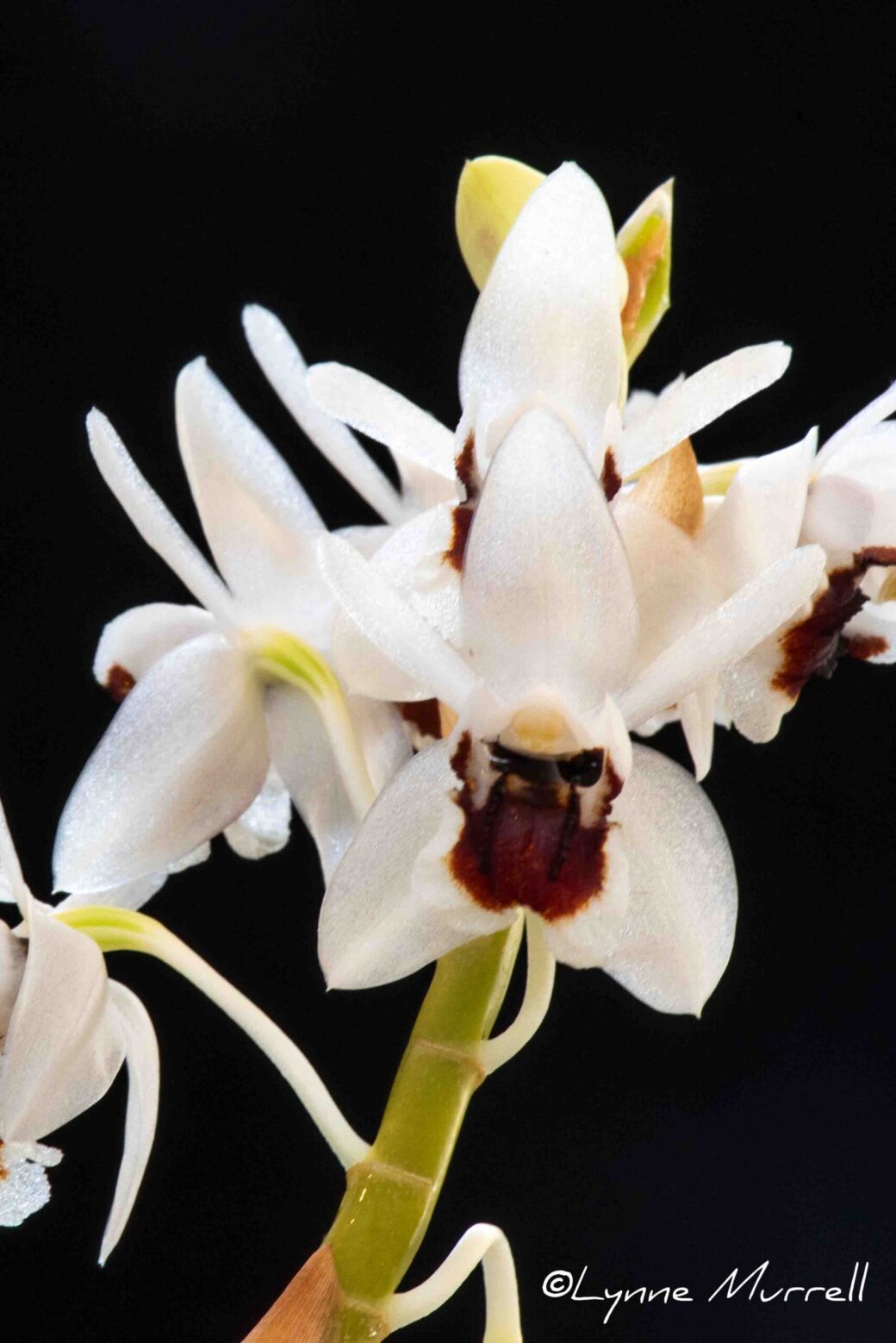 March 15, 2026 20261329 Cal. pulchella ‘Cleopatra’ (Species) HCC  77 Exhibited by Diane Bond Description: Sixty-seven charming flowers and eleven buds on eight upright up to 23-cm inflorescences; sepals and petals white; sepals ovate, petals linear; lip bifurcated white, black centrally, midlobe cordovan, keels dark cordovan, white margin; column cream, anther cap light […]