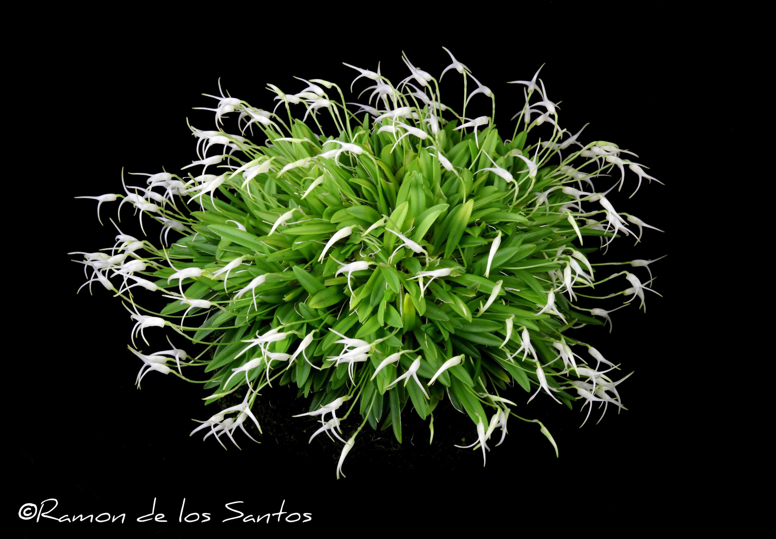 One hundred seventy-one flowers and forty-one buds magnificently and evenly displayed on a 30-cm by 15-cm plant grown on a 15-cm, round treefern mount; flowers chalk white, caudae tipped light chartreuse; lip yellow; substance firm; texture matte. Upgraded from previous CCM/AOS 85 point due to more than double the number of flowers ( from 81 to 171 ) and increase in plant size from 18 cm to 30 cm.