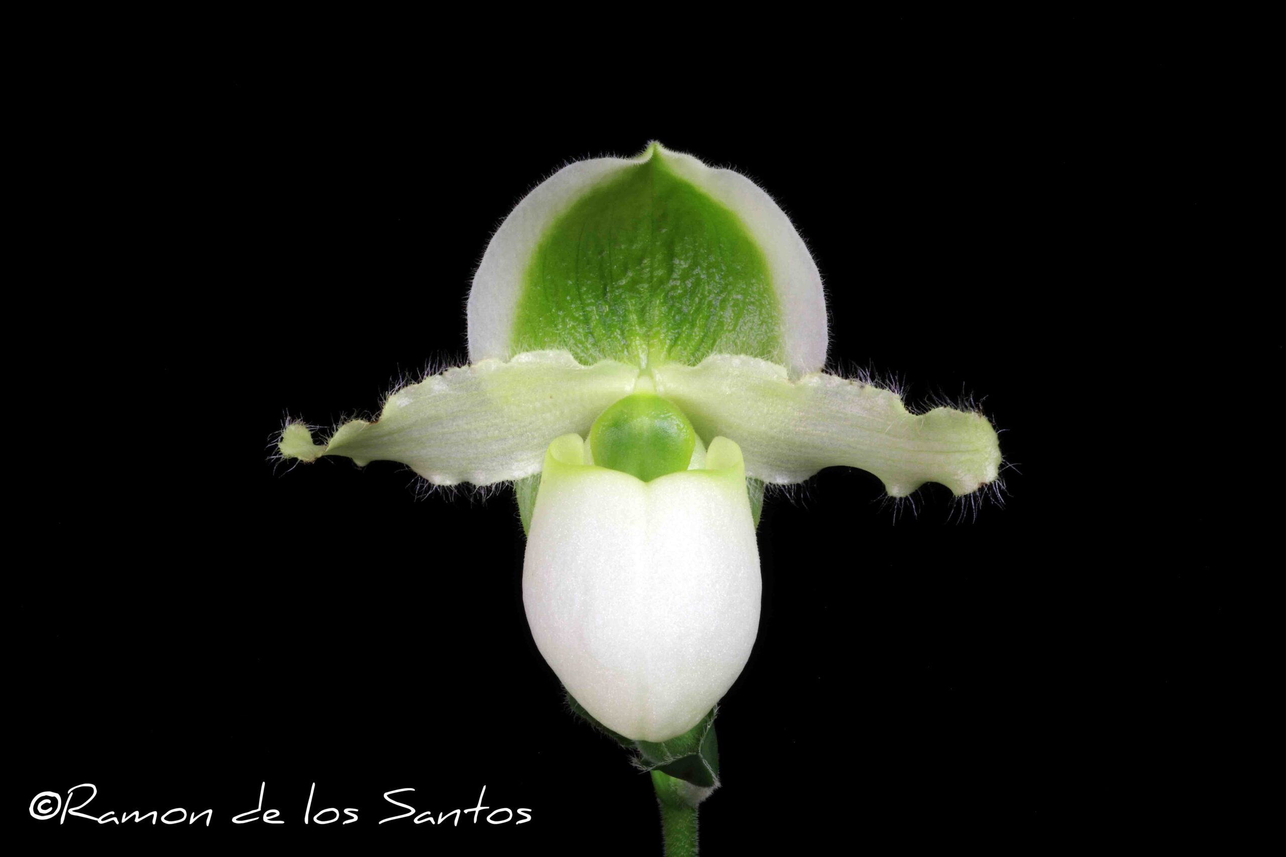 One flower and two buds on one 17.0-cm indeterminate inflorescence; sepals white, overlaid bright green centrally; petals pale yellow, hirsute on undulate edges; full pouch crystalline white, staminode green; substance firm; texture glossy, pouch diamond dust.