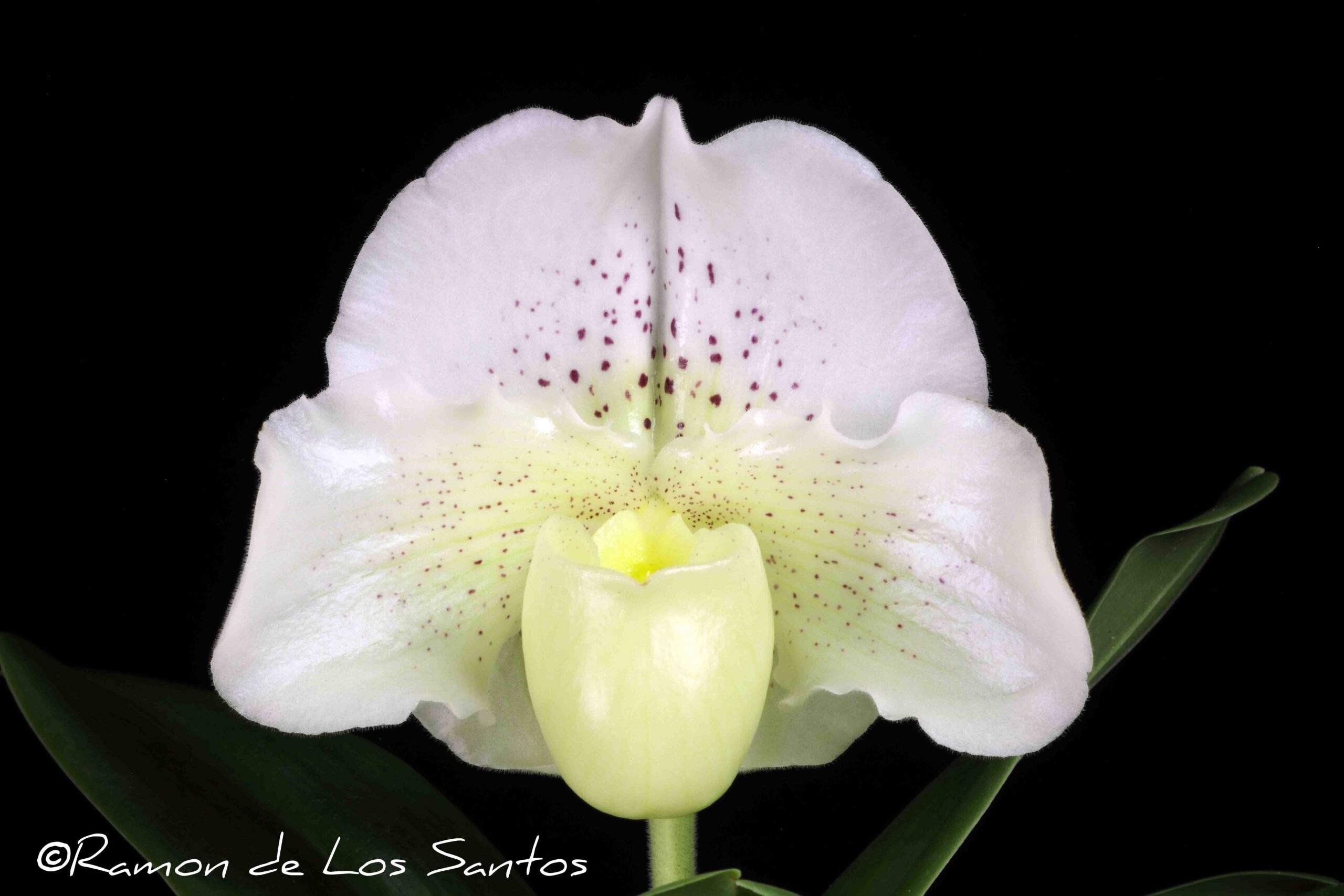 One flower on one 7.5-cm inflorescence; dorsal sepal white, chartreuse centrally, lightly spotted maroon; synsepal white, overlaid chartreuse, fine maroon spots; petals slightly recurved, white, overlaid chartreuse central half, fine maroon spots; pouch chartreuse, staminode chartreuse; substance firm; texture waxy.